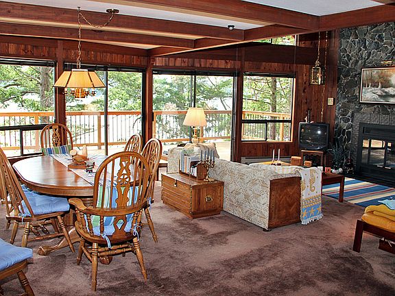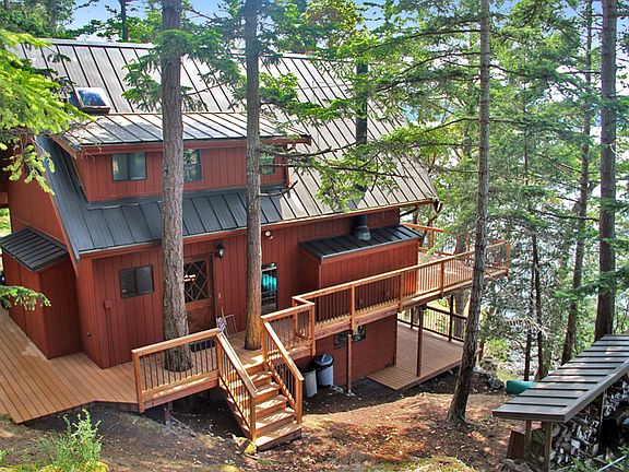 Center Island west-facing waterfront home with 1824+/- sf, 2 bedrooms, 2 baths, living room with vaulted ceiling, beautiful stained wood interior walls & ceiling, decks on both levels, a newer metal roof, utilities (power, telephone & water) and has been very well maintained, on 0.52+/- acres with 120'+/- shoreline including some rocky beach to explore. Center Island has a clubhouse, marina, gravel airstrip, boat launch, boat storage, and beachfront.