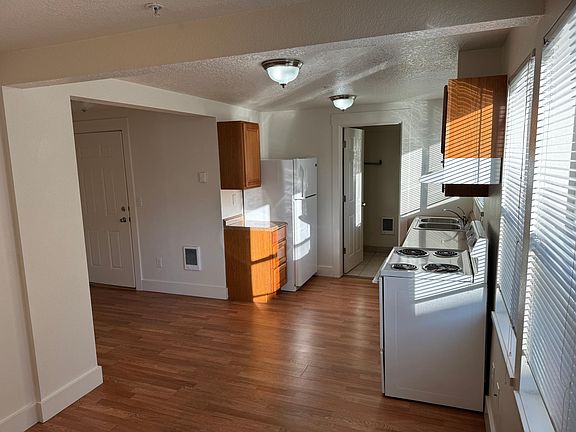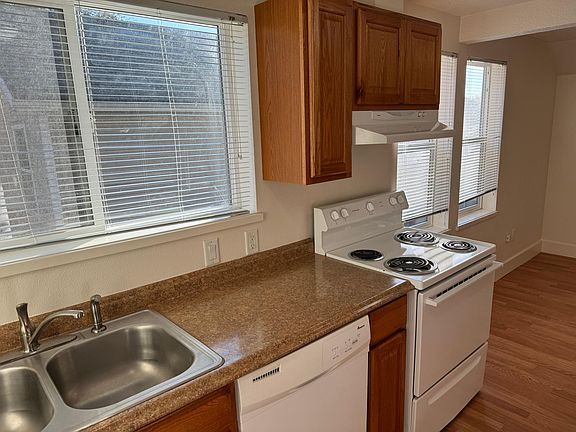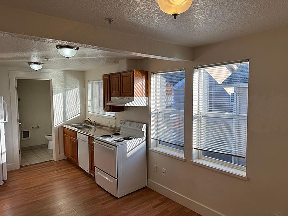 1 bedroom 1 bath apartment in a charming fourplex perched on top of a small hill surrounded by giant Redwood trees. It has large picture windows with views of Downtown. Few steps to the Prescott Max Station, bus routes, trendy restaurants, Zipcar, and I-5. This upper-level unit features new Miller neutral paint, an open floor plan, large double-pane windows, new oak-style floors, and a tile entry. The kitchen has new oak cabinets, new countertops, and a stainless steel sink. All appliances are energy-efficient and include a full-size range, refrigerator, dishwasher, and disposal! Rooms are zoned with 4 separate thermostats for efficient heating control. The bathroom has desert sand tiles, new fixtures, and an automatic vent fan. Laundry room on site. Venetian blinds all around. One-year lease. Off-street parking is Free.