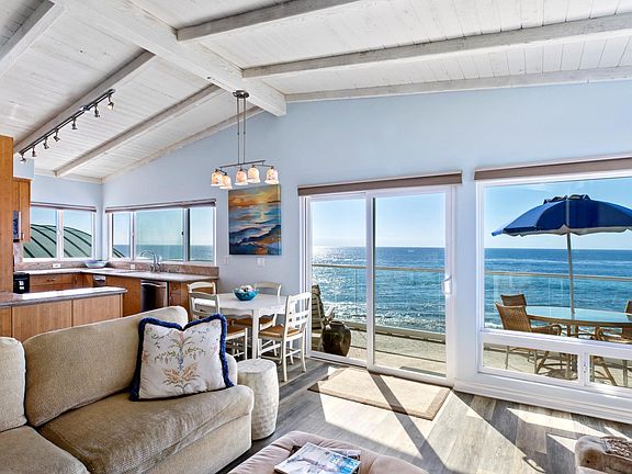 Beautiful ocean front two bedroom, 2 bath top unit on the famous Brooks Beach in Laguna. Beautifully furnished with vaulted beam ceiling and gorgeous views. Sliding windows to a large balcony over the ocean. Living room has lovely fireplace and large flat screen TV. Master bedroom has walk in closet and large flat screen TV. Bright and airy with lots of windows and mirrors for maximum ocean views. Mater bedroom has King bed and guest room has Queen bed. Private stairs down to the beach. One car garage parking and street level entrance. Walking distance to restaurants, art galleries and shopping. Available for lease by the month or long term. Available May 1, 2023. Single month $10,000. Long term or multi month $9,000. Summer rates apply June - August. More info at BeachHouseLaguna. Owner pays all utilities including Direct TV
