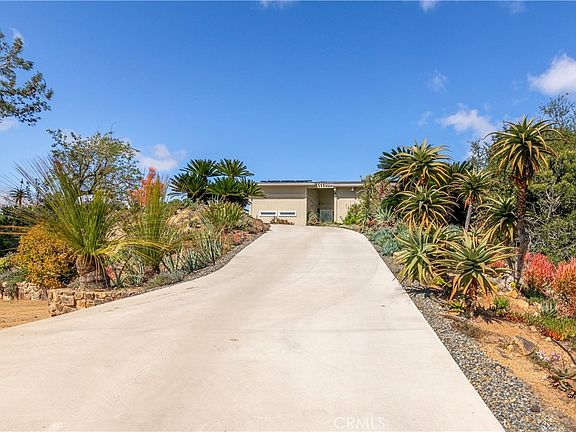 Nestled amidst the rolling hills of Fallbrook lies a hidden gem, a captivating Mid Century Modern home that exudes serenity and luxury. Set on 5 acres of lush land, this stunning property offers unparalleled privacy and panoramic views of the Santa Margarita valley and beyond. As you step through the front door, you are greeted by a meticulously remodeled interior adorned with oak flooring, custom window coverings, and a chef's dream kitchen. The kitchen boasts quartz countertops, stainless steel appliances, porcelain tile floors, and a subway tile backsplash. The family room is a haven of relaxation, featuring vaulted ceilings with wood beams, a slate fireplace, and expansive windows framing breathtaking views. The laundry room has been thoughtfully upgraded with sink, brand new cabinets and ample storage space. Each of the 3 bedrooms in this home is a sanctuary, complete with its own ensuite bathroom for ultimate comfort and convenience. The Primary Suite has its own access to the outdoor living areas. The Primary Bathroom has quartz countertops with dual sinks and a large walk in shower. Step outside and immerse yourself in the tranquility of the sprawling grounds, adorned with over 100+ avocado trees, succulent gardens, and a variety of fruit trees including tangerine, apple, lemon, pear, kumquat, and orange. The possibilities are endless with the 5 acres of land, offering potential for an ADU, guest house, or workshop. Additional upgrades include 18 PAID Solar Panels, New AC, HVAC, Heat Pump, New Ducting, Redone Driveway, Interior and Exterior Paint & Trex Decking. Perfectly secluded from the hustle and bustle of city life, yet just a 10-minute drive to the I-15 commute corridor, this property truly offers the best of both worlds. Don't let this once-in-a-lifetime opportunity slip through your fingers. Experience the magic of Fallbrook living in this unique Mid Century Modern masterpiece.
