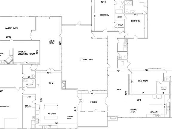 Unique Courtyard Style Ranch features Two Separate Residences off a Common Foyer and Central Courtyard; Right Side is 3 Bedrooms, 3.5 Baths, Living Room, Dining Room, Kitchen, Laundry and Garage; Left Side is 1 Bedroom with Fireplace, Living Room, Dining Room, Kitchen, Den w/Fireplace, Laundry and Garage; Custom-Built with Quality Materials and Finishes; 9' Ceilings, Wood and Tile Flooring. Walk-In Closets with Organizers, Custom Built-Ins Throughout; a Must See Property - Move-In Ready!