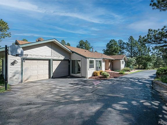 Escape to your little piece of Colorado country living, within minutes of Downtown Parker! Nestled on 2.79 acres, this property is surrounded by soaring trees and great natural light, making for a serene view out of every window in the home. This perfectly positioned home makes for great shade on the oversized trex back porch in the summer, and a fast melting snowy driveway in the winter. Upon entering, you are greeted with vaulted ceilings and exposed wood beams throughout. With multiple living spaces, including a light and bright sunroom, you can enjoy the flexibility of spreading out. This home has been updated where it counts with a fresh kitchen featuring granite countertops, spacious cabinets and newer stainless-steel appliances, recently updated bathrooms, brand new carpet throughout, fresh paint, and a newer 1500-gal septic tank. Downstairs you'll find a convenient walk-out basement, oversized family/bonus room, with a working wood burning stove-perfect for those snowy nights! Also located downstairs is another beautifully updated bathroom, 2 additional bedrooms, featuring great storage space and brand-new carpet. The large 960 outbuilding is outfitted with oversized doors, 4-inch-thick concrete floors, is wired with 220V, and has ample storage for all of your toys, farm equipment, and additional cars. Come experience the peaceful lifestyle of Ponderosa Hills, at this one-of-a-kind property!