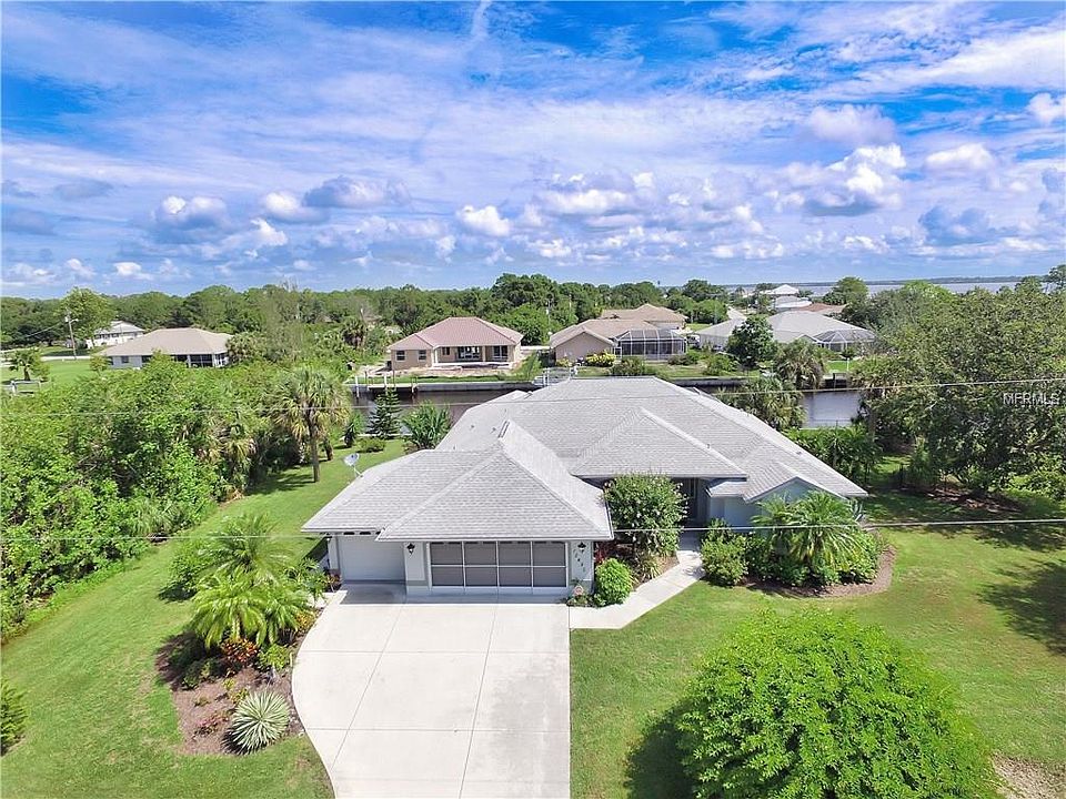 Custom Roberts built home on a double waterfront lot in Gulf Cove. The home features a split bedroom plan with access to the lanai thru the living room, master bedroom and kitchen area. The home is wheelchair accessible and offers an open floor plan and a 3 car garage and hurricane shutters on all windows. The large kitchen has an island and an aquarium window overlooking the nicely landscaped yard, the water and the lanai. The wood dock is minutes from open water and the neighborhood has several newer homes on the water. The pool is heated and faces North. Call to schedule your showing today.