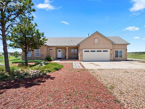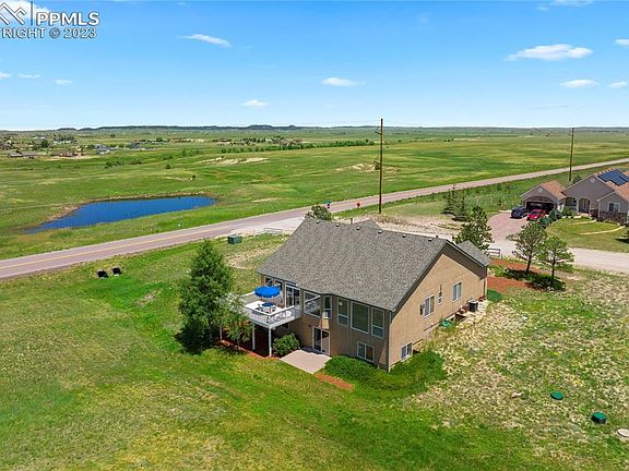 Looking for that perfect ranch floor plan in Black Forest with a Pikes Peak view? This is it! Former model home built by Vantage Homes. Boasting over 4,000 square feet, 4 bedrooms, 3 baths, 3 fireplaces, central AC and a 3 car garage space that is heated and cooled. One of the garage spaces it currently utilized as an office which would make a great workshop. Situated on a sprawling 2.5 acre lot providing you the perfect blend or privacy and convenience to amenities. Zoned for horses and other animals, outbuildings and RV's, allowing you to indulge in your equestrian passions or store your recreational vehicles with ease. Located only 2 minutes from the popular, state-of-the-art 45 acre Latigo Trails Equestrian Center which offers events, horse boarding, an indoor arena, two outdoor arenas as well as an onsite restaurant and retail shops. No HOA. The expansive great room was designed for entertaining. Hardwood floors, floor to ceiling windows with views giving the space an abundance of natural light, vaulted ceilings, fireplace, hardwood floors and a walk-out to the back deck. Primary suite with a 5 piece bath, walk-in closet and a 3 sided gas fireplace. The main level features a second bedroom and office with french doors. Open kitchen with a huge wrap-around island, pantry, hardwood floors, eating nook and tons of cabinet and counter space. Formal dining space with vaulted ceilings and architectural niches. Finished walk-out lower level. The huge family room provides the perfect space for relaxation or gathering with loved ones. A wet bar adds an element of convenience, making it effortless to entertain guests. Additionally, this level offers two additional bedrooms and one bath, making it ideal for accommodating guests or extended family members. Room to grow or for storage in the unfinished space.