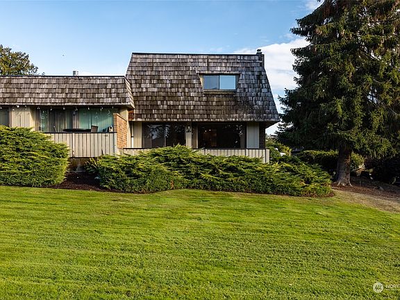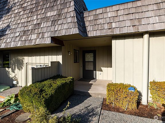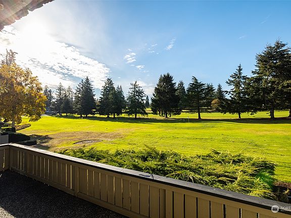 Desirable end unit condo overlooking the 9th fairway at Skagit Golf & Country Club. Entry has tile floors and opens to an updated kitchen with alder cabinets, stainless steel appliances including a built in microwave and gas stove. Spacious great room (room for a dining room table) w/built-in bookcases, gas insert fireplace + slider opening to 160 SF covered west facing patio w/lovely views of the golf course & trees. Upstairs primary bedroom has parquet wood floors plus a huge walk-in closet. Large second bedroom upstairs plus a remodeled full bath with tile floors and 2 pedestal sinks. Convenient laundry room upstairs and 1/2 guest bath on main floor. Attached, oversized 2 car garage with ample storage and room for a golf cart.
