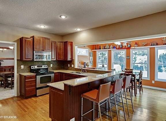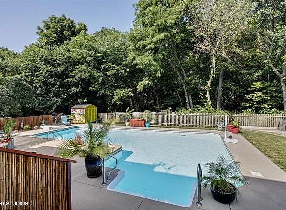 Breakfast/sun room addition overlooks 23' by 41' "L" shaped inground pool and heavily wooded greenspace. Pool heater added 2015 and pump replaced 2014. Kitchen remodel features custom built roll out shelve cabinets, granite counters, peninsula and hardwoods. Living room at entrance has crown molding, built in shelves and could be used as a home office. Laundry on bedroom level. Basement rec room being used as 5th non-conforming bedroom. Refrigerators in basement and kitchen, plus pool house/shed stay.
