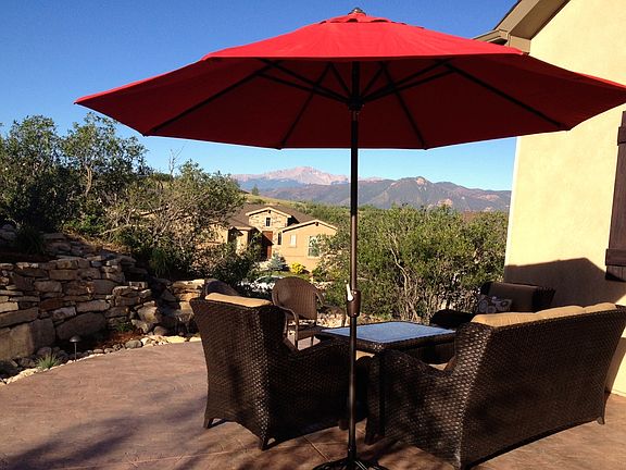 This fantastic 4 bedroom, 3 1/2 bathroom, 3-car garage home offers serious upgrades & stunning mountain & Pikes Peak views! Located in northern Colorado Springs, this property offers District 20 schools & is only 35 minutes from south Denver, making it ideal for any commute! Upgrades include professional landscaping, stained concrete patio, 2x6 construction, vaulted ceilings with beam detail, gas fireplaces, open concept living area, granite countertops, finished walkout basement, & covered deck with direct mountain views! A large, stamped concrete patio frames the front door while offering additional outdoor living space. Vaulted ceilings start at the wide entrance and continue into the main level living/great room, and feature beautiful beamed accents. The living room is focused around a gas-fireplace with stone surround, and has gorgeous picture windows to bring the outdoors and stunning views inside. The gourmet kitchen overlooks the living area and provides an island for extra work space, gorgeous solid slab granite countertops, a breakfast bar area, upgraded countertops, double ovens, and 6-burner gas range. It also overlooks the dining area that has access to the covered deck, ideal for grilling and entertaining! The main level master retreat is spacious with a bay window that capitalizes on the mountain views. The master bath offers an oversized soaking tub, separate shower, and double vanity! The main level also features a secondary bedroom, 3/4 bath, laundry, and garage access. Downstairs is a large family/rec area with a second gas fireplace, and walkout to the phenomenally landscaped backyard and second patio. The finished basement also provides a 1/2 bath and two secondary bedrooms that share a jack-and-jill full bath.