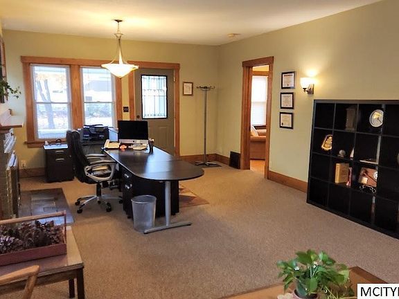 Quality Craftsman 3 bedroom, 1 1/2 bath home boasting 1336 Sq Ft on the main level. Full basement. The home features Quarter-sawn Oak Trim w/mortise/tenon joints. Home is Immaculately maintained and upgraded, soothing paint colors highlighting the Craftsman heritage. Large carpeted living room with brick fireplace w/oak built-in bookshelves. Tall 9 foot ceilings. Beautiful Oak hardwood floors. Newer Craftsman style lighting fixtures. Large Kitchen with custom built Maple Cupboards. Pantry room. Quaint dining room off kitchen. Vinyl siding, newer roof, metal soffits, tilt-in vinyl replacement windows throughout, steel exterior door. Impressive front open covered porch w/brick and stucco pillars. Rear patio. Fully Insulated in 2014. R-13 walls. R-49 Attic. New wiring and electrical service in 2008. 1 stall garage. Great Single Family Home, but currently used as a wonderful Professional Office. Walking distance to downtown cultural amenities, Frank Lloyd Wright Hotel, Ice Arena, and more!