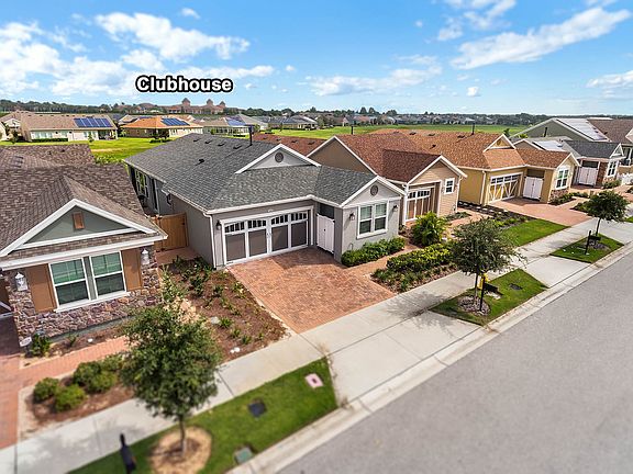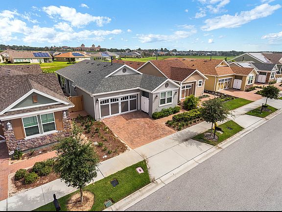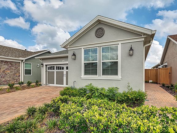 Upscale Trilogy 2 bed/2 bath home + den/office lot set against a green space behind with sunset views of Magnolia House on the horizon. $49k+ in builder upgrades & approx $10k of post-move in upgrades feat wood lam flooring throughout the living areas, 20" tile in the bathrooms, elegant 5.5" baseboards, crown molding, and custom built-ins in the living room, hallway niche, and den. The Kitchen has large center island w/ additional power/ storage, granite tops, tile backsplash, S/S appliances: 5 burner gas cooktop, upgraded 42" cabinets finished w crown molding and lighting pckg. The dining area is extended to the outside through glass sliding doors leading to a spacious paver courtyard patio space beyond. The den/office is right off of the great room and could be a poss 3rd bed. Enjoy garden and long greenbelt views out of the living room, the lanai, and the master suite. The owner's suite is washed in sunlight through large windows. The master bath has a comfort height granite vanity w/ his/hers sinks and sep garden tub, glass enclosed shower and a huge walk-in closet. The spacious screen enclosed covered lanai is extended privacy by intentional landscaping. The backyard is fully fenced with wrought iron to no obstruct view and has additional paver patio behind lanai. Trilogy HOA includes: guard gate, internet/cable, alarm, lawn/landscape maint, 57k sqft community center, fit ctr, resort-style pool/spa, bocce & pickle ball, tennis, & more!
