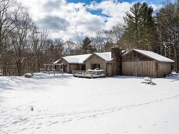 Privacy Galore!! This contemporary executive ranch sits on over 10 acres of complete privacy. This ranch sets back off the road features 3 bedrooms and 2 1/2 baths. Large rear deck which you can access from the family room, living room, dining room and master bedroom. Kitchen with vaulted ceiling features some newer stainless steel appliances and a large island. The cathedral ceiling Family room has beautiful hardwood floors and a wood burning fireplace with slider to the deck. Dining room and Living room are an open floor plan and are very large with hardwood floors. The master bedroom has hardwood floors and slider to deck along with good sized master bath with ceramic tile floor. 2 additional bedrooms are great size and also have hardwood floors. First floor laundry. Brand new boiler. Basement is huge and features a full size garage door to park an additional vehicle or 2. Shed/kennel. This homes needs some TLC, but with a little sweat equity this could be your dream home.