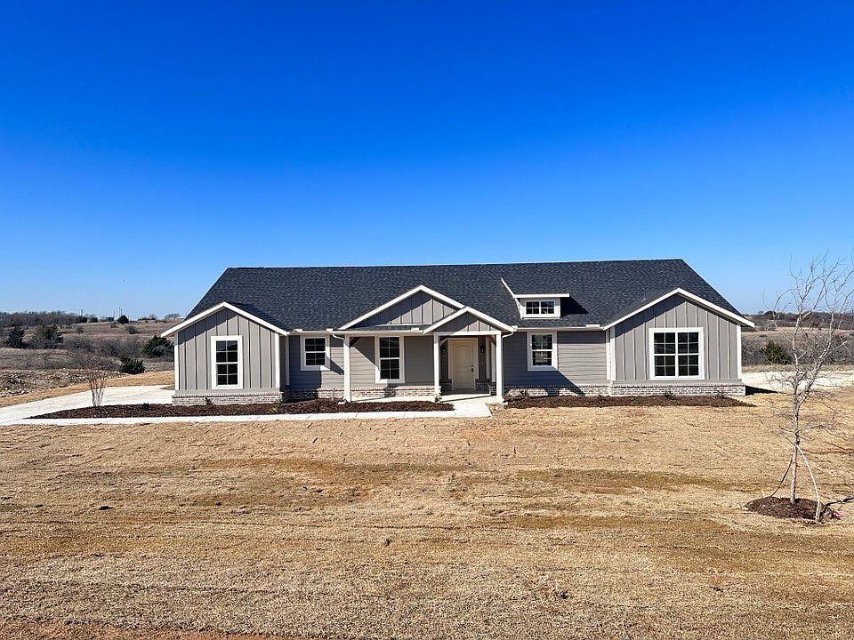 2 Acre homesite with beautiful views and topography at back, spacious open concept kitchen and dining overlooking family room, cast stone wood burning fireplace, large mud bench, huge walk in closet in Owner’s retreat, engineered wood in living area, covered back patio
