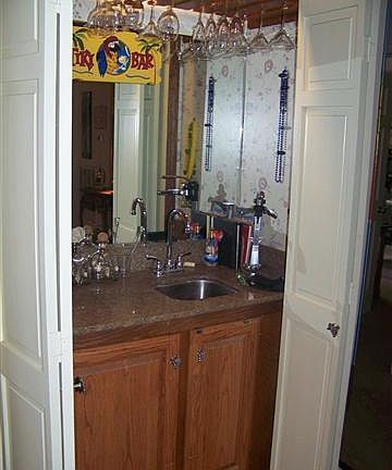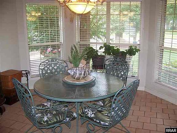 Front door opens to large, open family room with vaulted ceiling and kitchen/dining area. Master suite separate from other two bedrooms. Bright sun porch from den with area large enough for studio or office. Additional porch-covered patio and privacy-fenced back yard to enjoy the outside. Good storage throughout. Wet bar off living area adds to the charm of this well-loved home. Fountain on outside porch is not included.