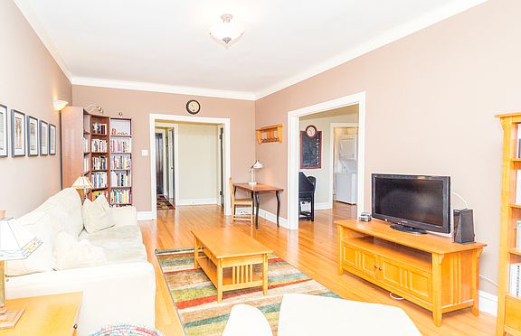 View our virtual 3D tour! Bright sunny & spacious one bedroom on top floor. Great location. Close to transportation and shopping. Each room is defined and separated. Lovely west/east natural light floods this unit. The unit features, hardwood floors throughout, nice kitchen with newer refrigerator. Washer/dryer in unit. Spacious bathroom, nice closet space. Rear back off unit porch and extra storage space in basement. Lovely unit!