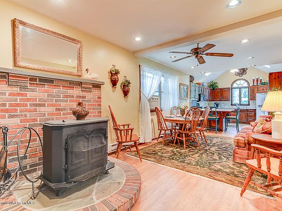 Classic County Cape located in quaint area of Farmingdale, picture postcard ready. Upon Entrance you will find a warm and inviting front porch ready for those hot summer nights, The newer Front door invites you in to a welcoming living area, beautiful hardwood floors, wood burning fireplace,with window seat.Open family room is great for entertaining, wood burning stove with brick hearth, Large eat in kitchen, laminate wood floors, plenty of cabinets, all applance package, valuted ceiling, skylights and sliding doors to patio. 3 bedrooms, 2 full updated baths, quaint sun room or den, full basement with workshop, cedar closet and bilco walkout. Backyard has plenty of space and you even have your neighbor already awaiting you. Dixie and Dakota await there new friends!