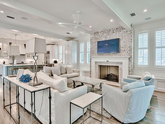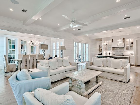 Located behind the private gates of WaterSound Beach, this coastal retreat boasts over 4,800 square feet of thoughtfully designed living space executed by the sought after architect T.S. Adams and the renowned building team at Dune Construction. A true icon of craftsmanship, the highest level of finishes and articulated positioning taking full advantage of the covetable Gulf views can be appreciated throughout. Upon entering the front door you are greeted by the foyer with charming ship lap lined walls and stunning wood flooring. Flowing seamlessly into the living area, the Chef's kitchen features custom cabinetry, an oversized island with an integrated breakfast bar, and a luxury appliance suite.