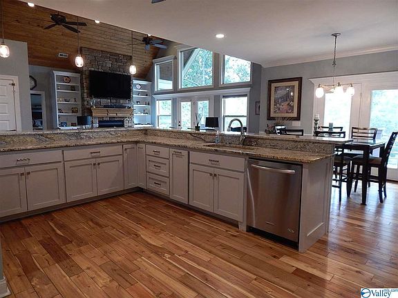 Amazing 5 bedroom/4 full bath custom lake view home on approx 1.7 acres with a marina & TVA public access just across the highway. Safe room downstairs against the mtn side with 12 inch concrete walls & ceiling & metal door. Amenities: hardwood/tiled floors, vaulted living room, gas log stone fireplace, large open floor plan, granite counter tops w/ shaker style cabinetry, stainless appliances w/ 2 separate ovens, warming drawer, sauna, security & surveillance cameras, storm shelter, tiled shower & soaking tub, concrete board siding, metal roof, dual level 40'x8' decks, daylight basement w/ bedrooms, 2 full baths, family room, plenty of storage, 400 amp electric service w/ manual generator.