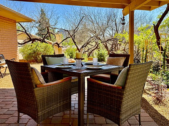 Charming two-bedroom, turn-key ready, single story spacious home offering exceptional quality craftsmanship at an incredible price in Sedona's Village of Oak Creek. Very private back yard, mature landscaping with covered patio and pergola backing to an Arroyo (natural wash). New floors, fresh paint, gorgeous, tiled hearth, mantle and electric fireplace provide a stunning focal point. Fully furnished - everything brand new from kitchen ware to linens. Beautiful kitchen features solid Kraftmade Cherry cabinetry with Corian counter-tops and decorative tile. Open floorplan for living and dining; electric fireplace to enjoy year round and air conditioning on warmer summer days. Double-paned casement windows; spacious primary bedroom with huge closets and private om-suite bathroom, new vanity and tiled walk-in shower. Second guest bedroom with full bathroom with new vanity. Huge 21X34 attached garage with floor to ceiling storage cabinets. Home is in a non-flood zone. Large laundry with walk-in pantry or additional storage. Ample attic space for extra storage. High pitched roof line, beautiful slump block-stone exterior with driveway pavers (great curb appeal). Flowering Oleander, Crepe Murtle trees and bushes for color spring through fall. Perfect short-term rental. Just bring your toothbrush and move in! Tennis and pickleball courts and golf a short walk to Oak Creek Country Club. Hiking trails, fitness gyms, golf memberships available. Residents in the Village of Oak Creek enjoy the picturesque canopy of red-rock country claiming Bell Rock, Cathedral Rock, Castle Rock, Courthouse Butte and Lee's Mountain within its view sheds. This is one terrific home! The Village of Oak Creek (VOCA) is an active adult, family and singles' recreational and homeowner's community. It is also domicile to the area's first and original golf course, the legendary Oakcreek Country Club. Located at the south gateway of world-famous Sedona, Arizona, VOCA (the HOA) is comprised of 25 subdivisions with 2,300+ households. Through an active operational approach, VOCA's work protects property values and appearances. VOCA's elected seven-member board of directors and management team focuses on the wants and needs of its members encouraging committee involvement and attendance at social events held throughout the year. Owner pays gardening upkeep, water, trash, tenant pays electric and internet