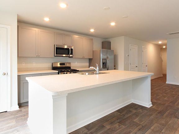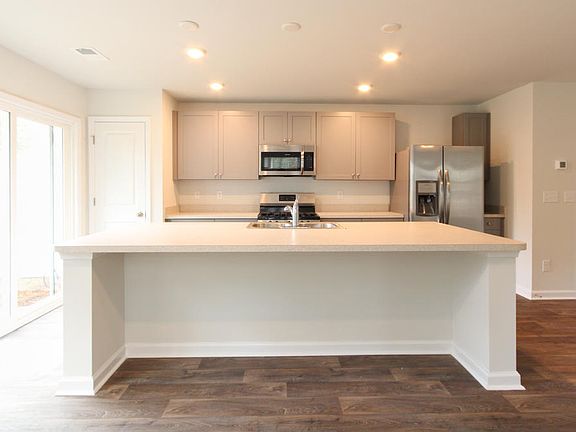 The Durham is a two-story floorplan with a single car garage featuring a large kitchen island to gather around and open living space. The second floor includes the owner's suite with walk-in closet and double vanities, two secondary bedrooms, bathroom, and laundry room.