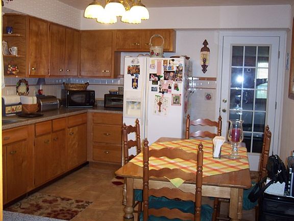 Immaculate Bedford Stone Ranch. 2 or 3 bedrooms with hardwood floors  Kitchen has nice Birch cabinets, range, refrigerator and dishwasher is included.  The home has 1 full bath and one half bath.  There is also a utility room and the washer and dryer stays with the home. Deck,  Single attached garage and detached garage. Central heat/air. Trees/ Shrubs. Located on dead end street in town.