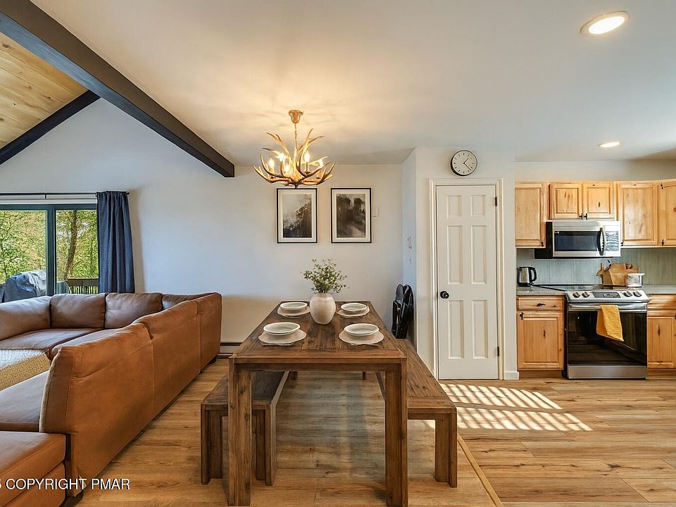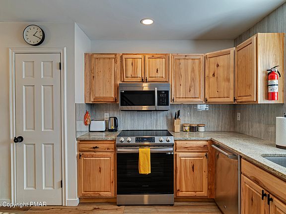 TURN-KEY 3BD/2BA STR AT CAMELBACK! This BEAUTIFULLY RENOVATED END UNIT perfectly blends modern comfort w/ rustic mountain charm, making it feel like the ultimate getaway. The BRAND-NEW Kitchen features granite countertops, stainless steel appliances, & plenty of cabinet space, ideal for gathering w/ friends & family after a day on the slopes. The open living & dining area is warm & inviting, w/ vaulted wood ceilings, a cozy corner hearth w/ a woodstove, & sliders leading to a spacious wraparound deck where you can relax & enjoy the fresh mountain air. The loft-style Primary Suite offers a peaceful retreat w/ its own private bath, while the lower level provides 2 additional bds & a full bath, plenty of space for everyone to feel at home. Fully furnished & ready to go, this property works beautifully as a profitable STR, a relaxing vacation home, or a comfortable year-round residence. Located just 90mins from NYC, you'll love being within walking distance to the ski slopes & Village amenities, w/ all the best Poconos attractions just a short drive away. Whether you're looking for adventure, serenity, or smart investment potential, THIS HOME TRULY HAS IT ALL.