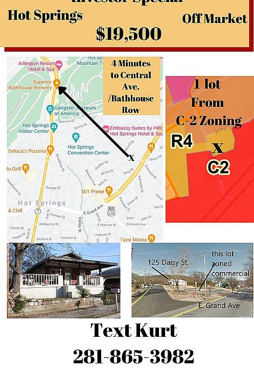 CALLING ALL INVESTORS!!! Hot Springs, AR Property is 1 LOT C-2 Zoning and Big Development is coming this way! 4 minutes from Central Ave. / Bathhouse District! Sold AS IS. TEXT ONLY 832-492-0700