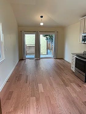Cozy Living Spaces: Warm wood flooring runs throughout the home, creating a cohesive and inviting atmosphere. The living and dining area opens to a private outdoor deck through sliding glass doors, ideal for relaxing or entertaining.