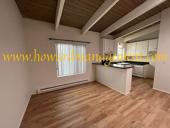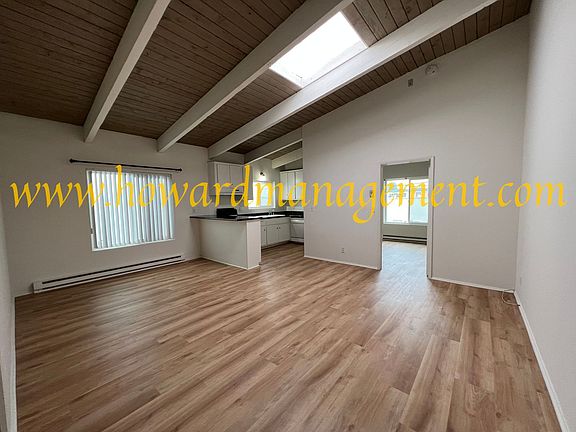 Beautiful bright top floor corner unit with hardwood floors and vaulted ceilings. Fresh paint throughout. Open concept layout integrates kitchen to living areas. Spacious living room with built in bookshelf and skylight. U shaped kitchen comes with granite counter tops, electric stove, and dishwasher. Master bedroom with private bathroom and plenty of closet space. Laundry facilities onsite. Water and trash are paid for. Sorry, no pets allowed. One carport parking space.