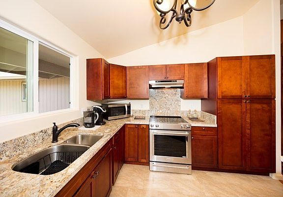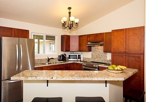 Sit on your lanai and listen to the tranquil sounds of water entering the koi pond below while taking in the gentle trade wind breezes. As the sun sets, the pond lights turn on automatically, creating a lovely ambiance. Located at the cul-de-sac of the street with little traffic, this home has been lightly lived in and upgraded to remain practically brand new. The nicely sized lot features a moderately steep driveway which allows for the home to sit high on the lot and take in unobstructed views of Mauna Kea.Inside you'll find all stainless-steel appliances in a nicely appointed kitchen with granite, dark wood cabinets, and a breakfast bar. An open floor plan and vaulted ceilings create a spacious, comfortable feel. Wood laminate floors flow throughout the rooms, adding a warm tone to the home. The granite countertops and wood cabinets are continued into the bathrooms as well. In the master bedroom, you'll find its own full bath and walk-in closet.Most everything you see is included in the sale. Move right in and have quality furnishings, a flat screen TV, the dishes, small kitchen appliances, linens, yard tools, and more.The finished garage with added storage houses the utility area with new washer and dryer and solar hot water heater, which means much lower electric bills. With so few newer homes in Hilo, this is one of the most affordable. Schedule your viewing before it's gone!