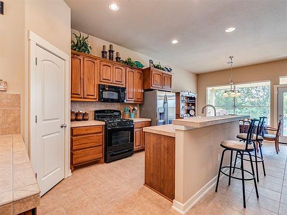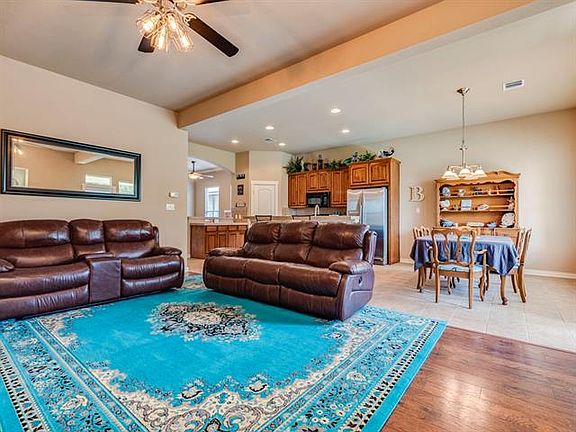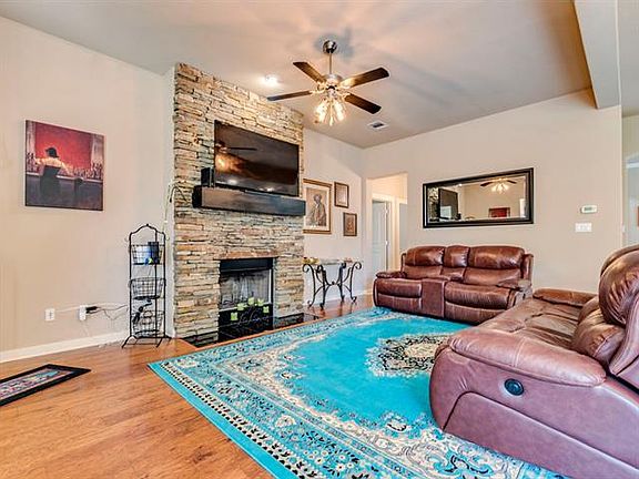 Fall is just around the corner! Cozy up to the beautifully inviting, floor to ceiling stone fireplace. Living space abounds with 2 living areas, open floor plan, with kitchen overlooking family room. Kitchen features gas cooktop, bar seating, and ample cabinet and counter space. Mannington Wood flooring in living areas, tile in entry, kitchen and bathrooms and carpet in bedrooms. Enjoy large covered patio overlooking greenspace in backyard. This home is move-in ready!