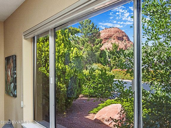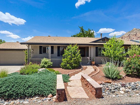 West Sedona charming ranch offering Views with backyard paradise is a treasure box. With NO HOA and a 2 minute walk to the Sugarloaf trail head, this darling home is ready for you to make it yours! Views from the Combo dining/kitchen with gorgeous granite counters, center island and loads of cabinets. Views from the Living room with a corner pot belly stove. HMMMM, toasty and cozy during Sedona's chilly nights. Peek a boo Views from the rear facing primary bedroom ensuite which offers a classy, detailed bathroom with a large deep soaking tub to dip down into and relax after a day of hiking. Ahh! Heaven! 2nd rear facing bedroom offers views and both the primary and 2nd bedroom have double built in closets. End to End 3rd Bedroom or Flex Room boasts Trapezoid Windows with Views and has its own separate heating and cooling mini split system. Best of all - fling open those sliding doors to your fenced backyard paradise with VIEWS, covered patio, luscious trees, grass, flower beds and flagstone walkways. Center open patio is plumbed for a hot tub or would be a wonderful place for a telescope to take in Sedona's dark skies. Gardening your thing? What a find, as both Front and back yard has been completely relandscaped and redesigned with flowering plants, fruit trees and paved gardens and all plants have their own drip emitters! Some of the numerous improvements include a new roof, exterior paint, addition of a reverse osmosis and water softener. Other treasures in this treasure box include being on the city sewer, natural gas, 2 car garage with extra side parking. So, plenty of room for a truck or a and a small RV. There are lots of trinkets and treasures at 125 Farmer Brothers! It's just waiting for you to open the front door and make it yours.