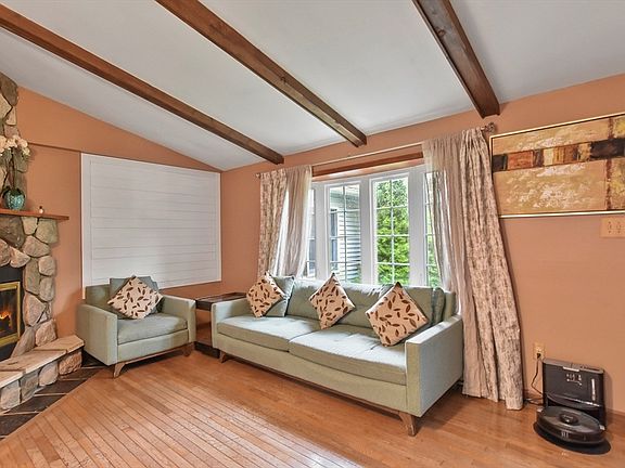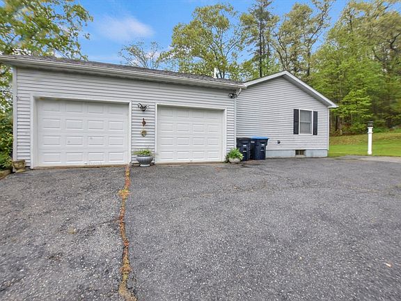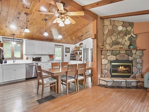 Nestled near the serene Webster Lake, this charming ranch home boasts a welcoming living room featuring gleaming hardwood floors, a striking beamed ceiling, and a floor-to-ceiling stone fireplace. The open-concept design seamlessly connects the living room to a modern kitchen equipped with stainless steel appliances, pristine white cabinets, and ample countertop space. The first floor also offers three generously-sized bedrooms, two full baths, and a spacious laundry room. Need more space? The partially finished lower level provides additional living space awaiting your finishing touches. Enjoy the convenience of a two car attached garage and plenty of off-street parking! All set on just over half an acre of land, this home is waiting for you! East access to highways and close to Indian Ranch!