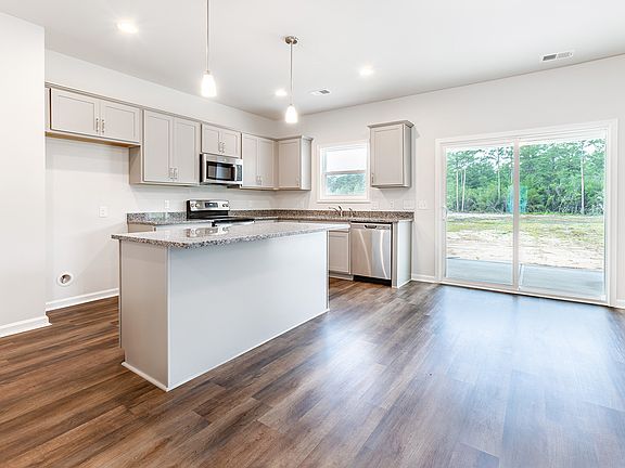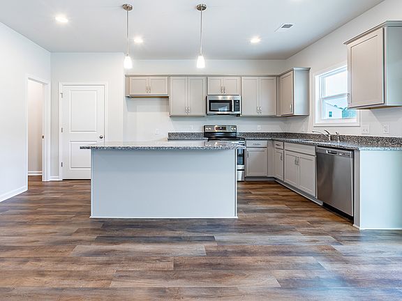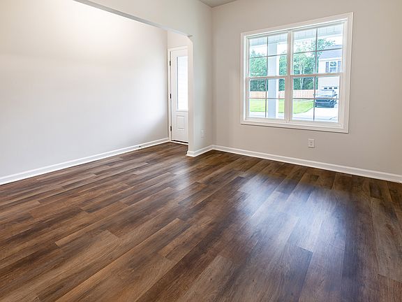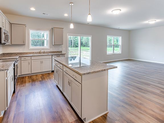 This two-story Meriwether has Three bedrooms, two and one-half bathrooms, a dining room immediately inside the front door and a covered porch. The kitchen features an island, upgraded cabinets, granite countertops, luxury vinyl plank flooring, eat-in area, and leads into the family room. Upstairs there are two spare bedrooms, both with walk-in closets, along with a laundry room and a full bath with luxury vinyl plank flooring. The primary bedroom has a tray ceiling and connects to the primary bathroom with luxury vinyl plank flooring, dual vanities, granite countertops, a linen closet, and a walk-in clothes closet.