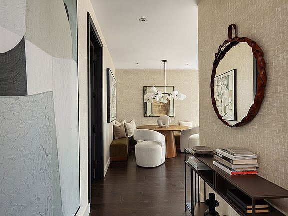 The formal entry foyer opens to the gracious living space, with 6" White Oak floor in light beige finish. The custom designed kitchen features a full suite of Miele appliances, a vented hood, polished nickel fixtures, cabinet veneer in light beige finish, and Fior di Pesco Carnico marble countertops and backsplash.