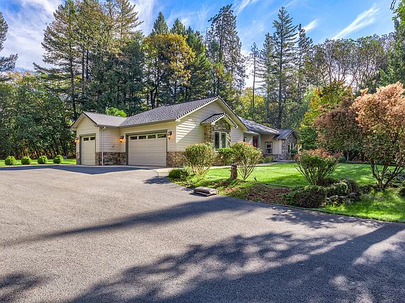 Private 5 acre setting, sits this beautiful single level Custom Built Home sitting at the end of a cul-de-sac just minutes from Grants Pass. As you step inside, an impressive great room welcomes you w/ abundant natural light & a stone fireplace with a built-in entertainment center. This home features 3 bedrooms plus an office, 2 1/2 bath. 3176 sq ft with quality features including, large kitchen with granite counter tops, stainless appliances, commercial style range, formal dining room, hardwood floors, lots of natural lighting throughout. Primary Suite with double glass doors to the patio. Suite bath with jetted tub, walk-in tile shower, dual sinks w/large walk-in closet with a skylight. Off the Suite is an office that can be used as a nursery/exercise room with a double sided stone fireplace. The exterior features include covered patio with stamped concrete, slab for a hot tub, 3 car garage, beautiful landscaping on irrigation system, circular paved driveway and gated entry.