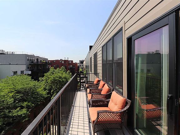 No broker fee NYC Views! 1 car parking included for this beautiful elevator-building featuring a huge balcony AND a common backyard with built in gas grill, a heated garage, Pre Wired for Verizon FIOS, video Intercom system and Indoor bike parking Top floor apartment has 1200+ square feet of living space, a private full sized washer/dryer, wide plank oak floors, high efficiency central air system (Heating and Cooling), bosch appliances, granite counters, under-mount sink, large closets, huge rooms and an overall modern design.