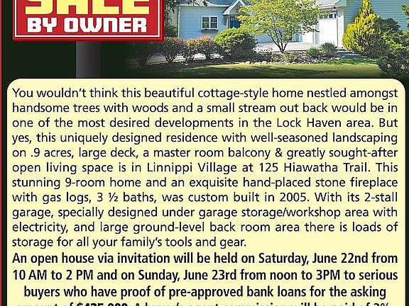 You wouldn’t think this beautiful cottage-style home nestled amongst handsome trees with woods and a small stream out back would be in one of the most desired developments in the Lock Haven area. But yes, this uniquely designed residence with well-seasoned landscaping on .9 acres, a large deck, a master room balcony & greatly sought-after open living space is in Linnippi Village at 125 Hiawatha Trail. This stunning 9-room home and an exquisite hand-placed stone fireplace with gas logs, and 3 ½ baths, was custom built in 2005. With its 2-stall garage, specially designed under garage storage/workshop area with electricity, and large ground-level back room area there is loads of storage for all your family’s tools and gear. An open house via invitation will be held on Saturday, June 22nd from 10 AM to 2 PM and on Sunday, June 23rd from noon to 3 PM to serious buyers who have proof of pre-approved bank loans for the asking amount of $425,000. A buyer’s agent commission will be paid of 2%. Please email or call if interested.