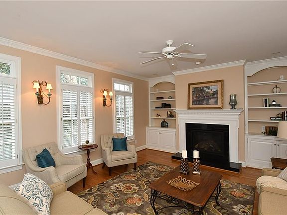 Everything you want in popular, convenient gated community. Cul-de-Sac lot w/private deck overlooks wooded backyard. Open concept kitchen, breakfast area & great room w/tiled dry bar & built-in cabinets. ML & deck wired for sound, recently refin hardwoods, fresh paint, new cpt in MBR, plantation shutters. Finished bsmt includes study/guest BR, full BA & den. BR 2 w/ dormer & 2 closets, BR 3 w/ sitting area & walk-in closet. Walk-in attic, good base. storage, yard maintenance included.