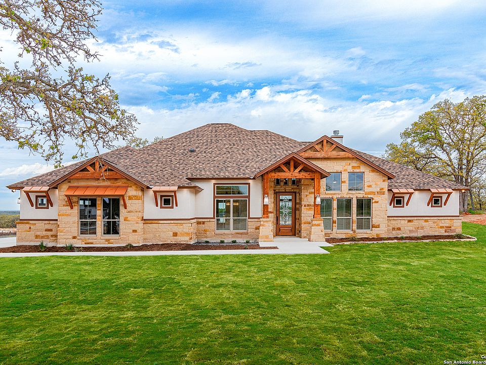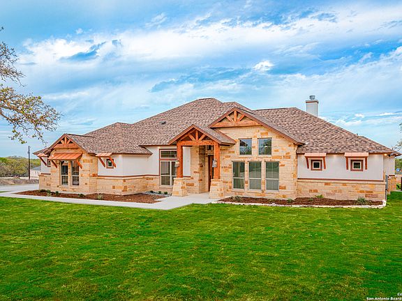 Situated on a hill with views, in La Vernia's new Hondo Ridge community w/Fiber Internet, you'll enjoy this spacious 1 Acre of Texas Countryside boasting a Spectacular New Home + 3-car garage! Ask about Low-Interest-Rate Incentives through Preferred Lender. Journey inside to experience the refreshing ambiance of bright open-concept living spaces, overflowing with upgraded features & special touches. Rustic elegance with dazzling modern comfort! EXPANSIVE LIVING ROOM: High vaulted ceiling w/wood beams, stately rock fireplace, abundant Pella Windows. DREAMY ISLAND KITCHEN: Premier KitchenAid appliances, dual sinks, pot filler at cooktop, fabulous island layout with gleaming granite atop stylish custom cabinetry + sparkling hardware. Ample Breakfast Room + Formal Dining, which could function as a dedicated study/office if desired. LUXURY MASTER: Dramatic vaulted ceiling, delightful windows, lavish bath, dual closets, one of which conveniently connects to the Generous Laundry Room. Attention to Detail continues throughout 3 additional bedrooms, one with ensuite bath - perfect "2nd Master" mother-in-law suite. Special family gatherings await on the GRAND BACK PATIO! 1-2-10 year Bonded Warranty, and numerous additional upgrades! Exterior photos show example of optional landscaping package, an upgrade available at additional cost.