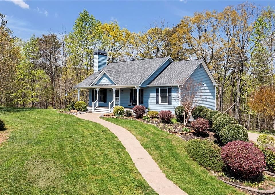 Welcome to this inviting ranch-style home, where comfort and elegance blend seamlessly amidst surroundings. As you approach, a covered rocking chair porch adorned with swing welcomes you, inviting relaxation amid the tranquility of the outdoors. The landscape surrounding the home is meticulously maintained, boasting lush greenery and vibrant blooms that enhance the curb appeal. Step inside to discover a haven of warmth and sophistication, with hardwood floors gracing the interior and creating a sense of timeless charm. The living room boasts a vaulted ceiling, creating an airy ambiance that enhances the spaciousness of the area. The living room seamlessly flows into the breakfast area, providing an ideal space for casual dining and gatherings. The kitchen exudes both style and functionality, featuring granite countertops & a new refrigerator. Retreat to the primary bedroom, where a trey ceiling adds a touch of elegance to the space. The ensuite bathroom is a luxurious retreat, featuring granite countertops, a double sink vanity, a soaking tub, a separate shower, and a spacious walk-in closet, providing the ultimate in comfort and convenience. Two additional bedrooms offer cozy retreats for family members or guests. Venture downstairs to discover a spacious basement boasting two large flex rooms, perfect for entertainment or recreation. The two-car garage provides ample parking space and additional storage room for your convenience. Outside, a separated metal garage offers extra parking space and storage, while a storage building houses a John Deere D-130 Rider and various items for lawn work, ensuring that outdoor maintenance is a breeze. Experience relaxing living in this exquisite ranch home.