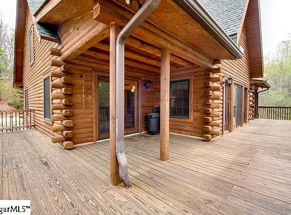 This custom built, spacious Southland Log home is situated on 12.97 acres just a few minutes outside of the quaint town of Pickens, SC, Minutes from the mountains and 25 minutes to downtown Greenville, SC. The home is nestled away from the road with a winding drive and plenty of privacy. Wildlife, awe-inspiring wooded property with hiking trails, two freshwater springs, a stream across the property and Dogwoods can be found on the acreage. With 3800 sq. feet and 3 floors, there is plenty of space for just about anything. The spacious central area on the main floor includes the great room with a high-beamed ceiling, dining room, kitchen and kitchenette. The master bedroom off the great room has sliding glass doors onto the deck and a spacious bathroom with Jacuzzi tub and luxury shower unit. 4 bedrooms, 4 full bathrooms The office with a separate full bath can be used as a 5th bedroom. The basement includes a finished great room with , and double-doors to the patio offering a private entrance. Set apart is 2 bedrooms and oversized full bathroom offering privacy. In addition, there is a full kitchen The workshop is a separate room in the basement allowing for containment of most noise, dust and dirt. Another set of double-doors open to the basement concrete deck and the solid, practical cement floor offers a base for even substantial stationary power tools, fixed saws, and is large enough for your 4-wheeler, motorcycle or your riding lawn mower! The interior walls of this custom log home are a mixture of painted drywall and pine logs. The interior designer décor includes luxurious colors, handcrafted, one-of-a-kind woodworking and blacksmith iron railings. Wood, ceramic tile floors throughout the house. The kitchen and bathrooms have custom-built stained cabinetry. The 2-car garage is attached to a custom-built mudroom connected with a beautiful entryway with custom woodwork and masonry The Hardy wood stove saves hundreds of dollars in heating bills, or you can use the electric water tank. The back yard with large entertaining space with a fireplace and pizza oven offers a relaxing place for friends and family. A large 2 car workshop and barn with concrete floor and beautiful barnwood siding is a fantastic place for a workshop.
