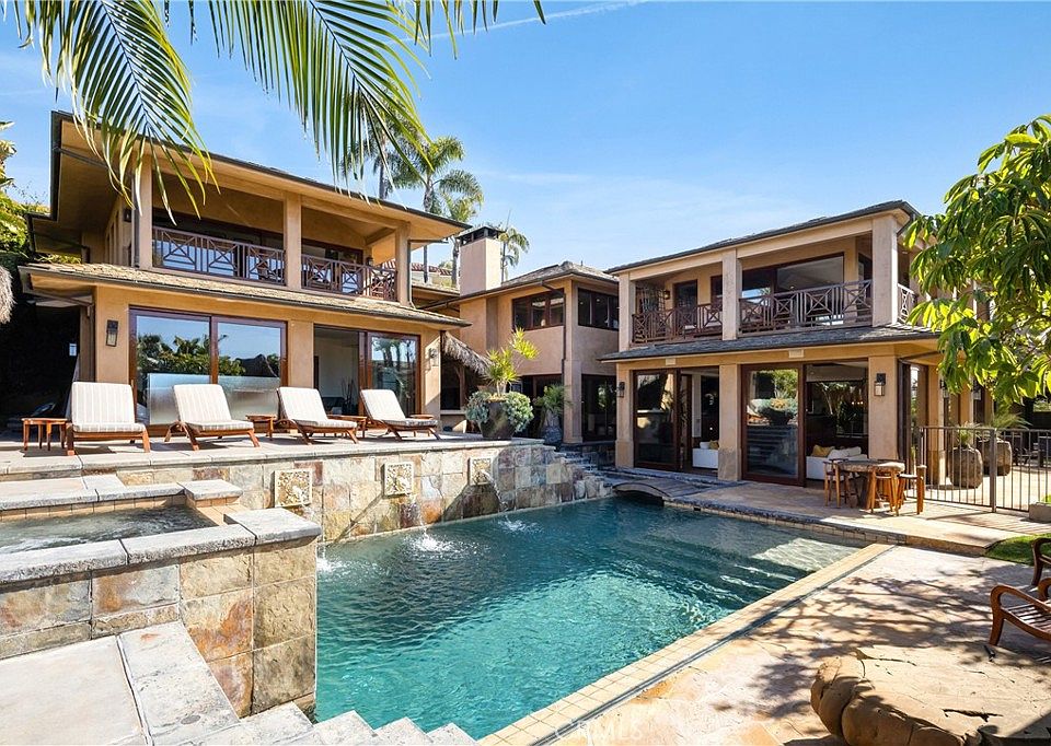 Welcome to Irvine Cove, the most exclusive gated community in Laguna Beach. This custom estate spans over 6,000 square feet, offering breathtaking ocean views and an unrivaled resort-style lifestyle. A private guesthouse, outdoor kitchen, and direct beach access elevate the experience of coastal luxury. Designed for seamless indoor-outdoor living, expansive sliding glass doors and grand windows flood the home with natural light. The primary suite is a sanctuary, featuring a serene spa-like bath with a sculptural stone soaking tub overlooking the coastline. Crafted with exquisite materials sourced from Bali, the residence exudes an organic ambiance. Unwind in the sunken living room, beside the tranquil koi pond, or in the intimate cabana warmed by a fireplace. The upper level boasts opulent bedroom suites, each opening to resort-inspired verandas. Community amenities include private pickleball and tennis courts, as well as your own golf cart for effortless exploration. With meticulous craftsmanship and an artful blend of textures and finishes, this estate offers a transcendent living experience. Tiered terraces lead to a pool, spa, outdoor bar, and multiple alfresco lounge areas, ensuring every moment is immersed in beauty and tranquility. Privacy, luxury, and coastal elegance converge in this extraordinary retreat where every day feels like a vacation.