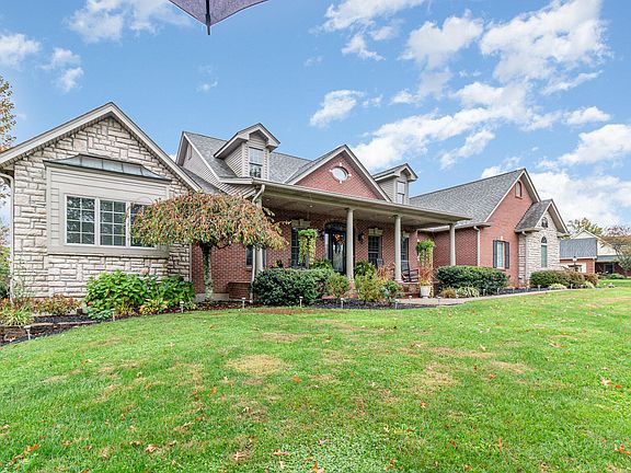 Beautiful brick-and-stone ranch just 1 mile from I‑75 — an ideal location: 25 minutes to Florence, 45 to Georgetown, and 1 hour to Lexington. This well-maintained Dry Ridge gem blends elegant finishes with comfortable, functional living. Home is a 4 bedroom / 4 full bath and 2 1/2 bath home. This home has an inviting front porch which leads into a bright, open floor plan with hardwood floors throughout the main living areas. Formal dining room off the foyer which leads to an open-concept living room with built-ins and a marble-accented gas fireplace. Chef-ready kitchen with durable solid-surface counters, stainless appliances including an induction range, pantry, custom cabinetry, and a planning desk. To the side of the kitchen there is a casual dining area which opens to a patio and private in-ground pool. The backyard is chain-link fenced with double gates and additional privacy fencing around the pool and firepit for your family enjoyment. In the home a Luxurious primary suite featuring tray ceiling, gas fireplace, jetted soaking tub, tile shower, double vanities, and a large walk-in closet. A Large laundry room is located directly across the hall. Main level also includes a dedicated office, two additional bedrooms each with private-bath finishes, a guest half-bath, and a poolside half-bath for convenience.
