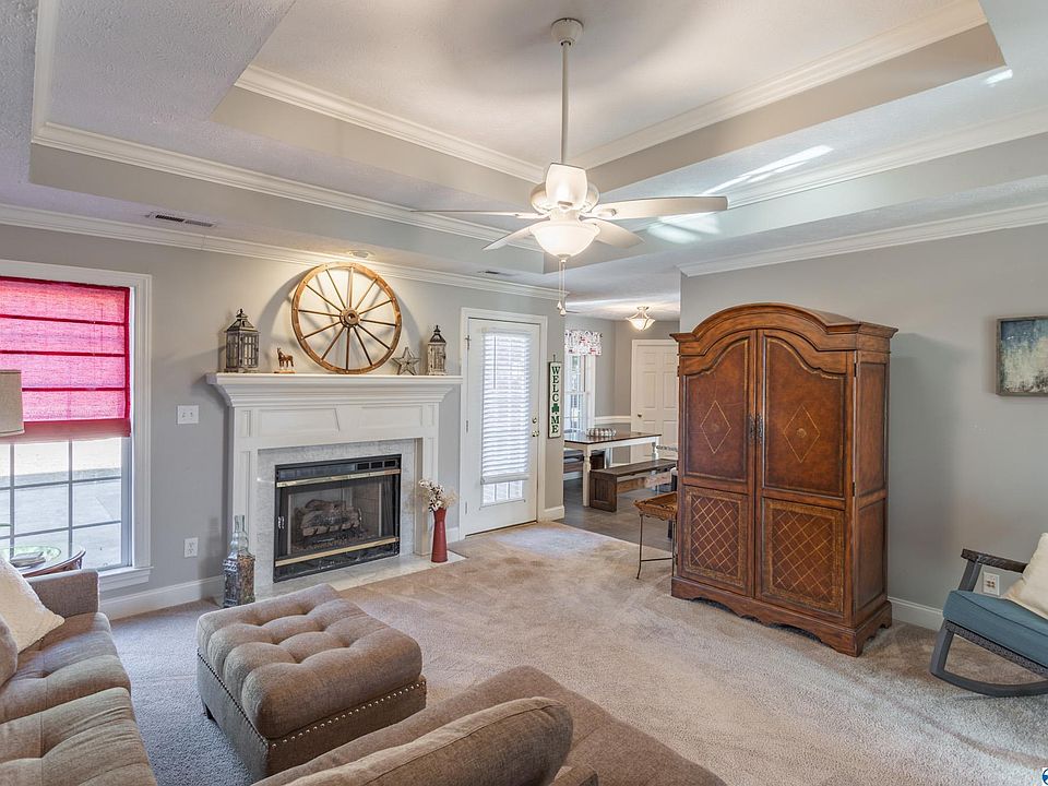 - RoomLivingRoomFeatures: Ceiling Fan(s), Fireplace, Carpet, Tray Ceiling(s), Crown Molding