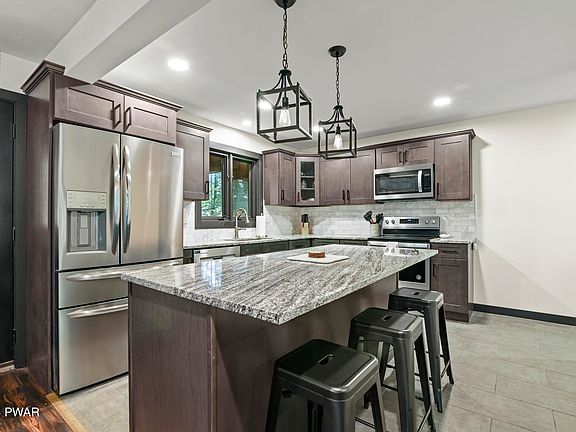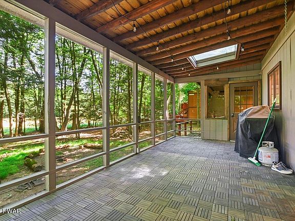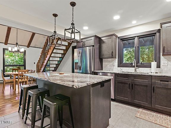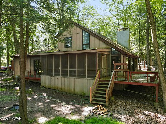 This home is just steps away from beautiful Tanglwood Lake. Enjoy the beautifully renovated interior - featuring a kitchen with stainless steel appliances and granite counter tops, and two renovated bathrooms with tiled showers. The washer and dryer room is conveniently located on the main floor, which also has a sink with granite counter tops and a newer washer/dryer. There is ample living space in this home. The main floor welcomes you with a large family room, this is a multi purpose space that could be used as a sitting area, office, or extra sleeping space! There is one bedroom and a full bathroom on the main level. The stunning kitchen open into the open concept living/dining area. Upstairs, there are two more bedrooms and a full bathroom. Enjoy the outdoors with the expansive screened-in porch, perfect for grilling and relaxing! This great space overlooks the back yard fire pit and the golf course (*currently not in operation). This is a prime location in Tanglwood Lakes. The outside of the home needs a little bit of love, but the inside is beautifully done and ready for you to enjoy while you do some work to the outside! Not only is this great property only a short stroll to Tanglwood Lake, a peaceful non-motorboating lake, you are only a short drive away from Lake Wallenpaupack! There is a relaxing community beach with a pavilion overlooking the lake. This house and community really does have it all! Come see it today