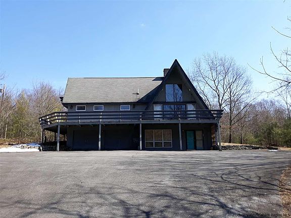 A spacious A frame home with a contemporary addition sitting on a manicured, semi private lawn with a small deep pond and woods to roam in. There is extensive decking and 3 sets of sliding glass doors. The ground level encompasses: Entry, family room, office, bathroom and 2 car garage. The 2nd level offers bedroom, bathroom, living room w/fpl, kitchen and dining area. The 3rd level-2 more bedrooms. In addition to the 2 car attached garage there is a 24 X 32 detached garage/workspace with a 12' overhead door, approximate 15' ceiling height and parking area. The original home 1968} was built/insulated for electric heat. The left side is thought to have been built in 1971.