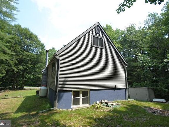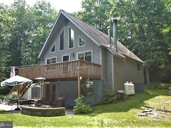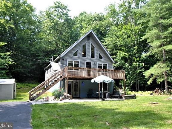 Chalet in the community of Thornhurst Country Club Estates. This 3 bedroom, 2 bath chalet has everything you need for modern living in the quiet of the woods. Lower level has a propane brick surround free stand fireplace in the family room, one bedroom, one bath and a laundry area for a stackable washer/dryer. Upstairs has hardwood floors, living room with a wood burning brick fireplace & cathedral ceilings, a kitchen with big granite counters, tile floors, cherry cabinets and an eating bar. This level also has 2 bedrooms, a full bath, and a linen closet. The 3rd level has a loft area for extra space. Home has a paved driveway, shed and a front deck above the lower patio area. Home also has public water and public sewer!