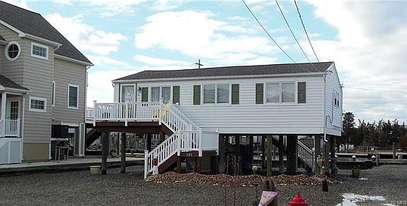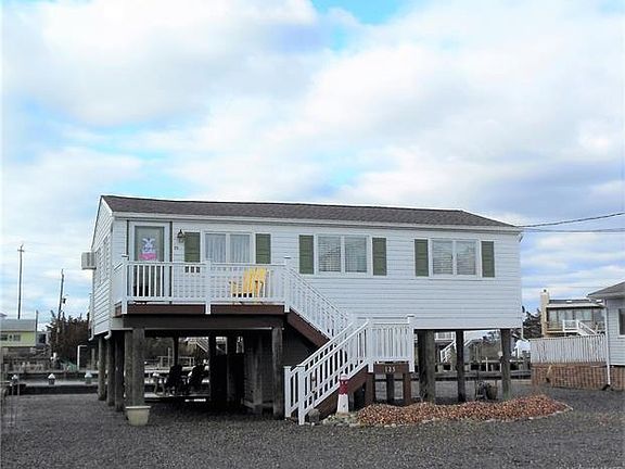 Take a look at this stunning waterfront home with quick bay access on deep wide lagoon. Warmed by natural gas thermostat controlled free standing wood stove is lovely and meticulously appointed home boasting open floor plan, vaulted beamed ceilings, new hand carved wood (laminate) floors, stone counter tops, glass back splash. vinyl wrapped railing on stairs, front and back decking, newer roof, vinyl sided including all the appliances ready for you to enjoy immediately. This is a must see. was NOT affected by "SANDY" , this home was high on pilings prior to 2012.