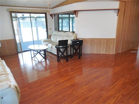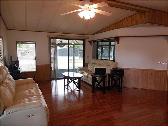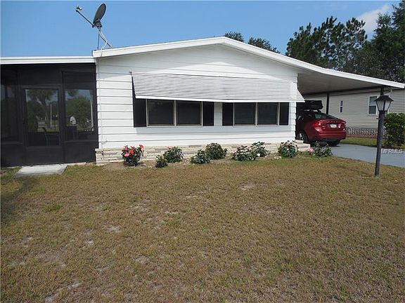 Very clean and neat home with 2 bedrooms and 2 baths on a beautiful corner lot close to the entrance. Very quiet. The house was painted inside and out about 1 year ago. The kitchen stove, refrigerator, dishwasher and garbage disposal were replaced in 2016. Large living room and dining area. The screens in the screen rooms were replaced 1 year ago.. The living areas and bedrooms have beautiful laminate floors that are 2 1/2-3 years old. The shed has a golf cart door to store a cart as well as a workshop/storage area. The laws has an automated sprinkler and timed lighting. You will find an orange, lemon and grapefruit tree on the property. The yard also has a gourmet herb garden, hibiscus, gardenia, and bougainvillea plants. Room dimensions are approximate, please verify. No lot rent, own your own land. Monthly HOA fee only $40 a month, plus a $20 fee every January. This community has 2 swimming pools, 2 clubhouses, a golf course, workout room, library, tennis courts, shuffleboard courts and horseshoe pits. Also, it is close to Disney.