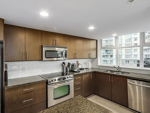 SPECTACULAR WATER VIEW and located next to the seawall! This stunning unfurnished 1293SF luxury corner unit in conveniently located "Creekside" is on the 7th floor and has 2 bedrooms + den and 2 bathrooms as well as an extra large 215 SF balcony overlooking False Creek and downtown - expect incredible sunsets! The luxurious suite features an open concept kitchen/dining/living area with a newly installed electric fireplace and large gourmet kitchen with stainless steel appliances and granite counters. A brand new LG washer and dryer, updated white oak hardwood floors, fresh paint, & new blinds complete this very bright southwest-facing home. Just steps to the seawall and skytrain station, as well as Chinatown, Tinseltown, Yaletown, and Downtown. Pets allowed. 1 parking stall included. Optional 2nd parking stall available for $100 a month. Move-in ready now. Building amenities include: * Gym * Steam * Sauna * Party Room * Private Courtyard with Benches * Bike Storage Rooms Minimum 1- year lease required. Owner pays strata fees. Renter pays for services such as electricity and wifi and move in/move out fees. If pets, additional pet deposit required. Second parking spot is available for a fee.