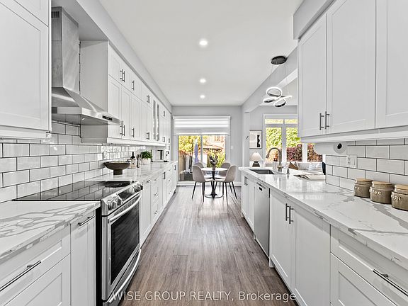 This stunning 3-bedroom, 3-bath townhouse is tucked away on one of the quietest streets in highly sought-after Thornhill Woods. Enjoy 9-foot ceilings on the main floor and a fully renovated kitchen (2021) featuring sleek stainless steel appliances, quartz countertops, a breakfast bar, and an abundance of cabinetry - perfect for storage and style. The inviting eat-in dining area opens to a private backyard, ideal for entertaining or relaxing with family. The open-concept living and dining rooms create a natural flow for gatherings, while the split-level family room, filled with natural light, offers the flexibility to serve as a 4th bedroom, a home office, or a cozy retreat. Upstairs, unwind in the freshly renovated (2025), spa-inspired primary ensuite - your personal sanctuary after a long day. Located close to top-rated schools, parks, community centers, shops, restaurants, and public transit, this home perfectly blends comfort, style, and convenience. A truly must-see property that's dangerously move-in ready - where every detail feels just right.